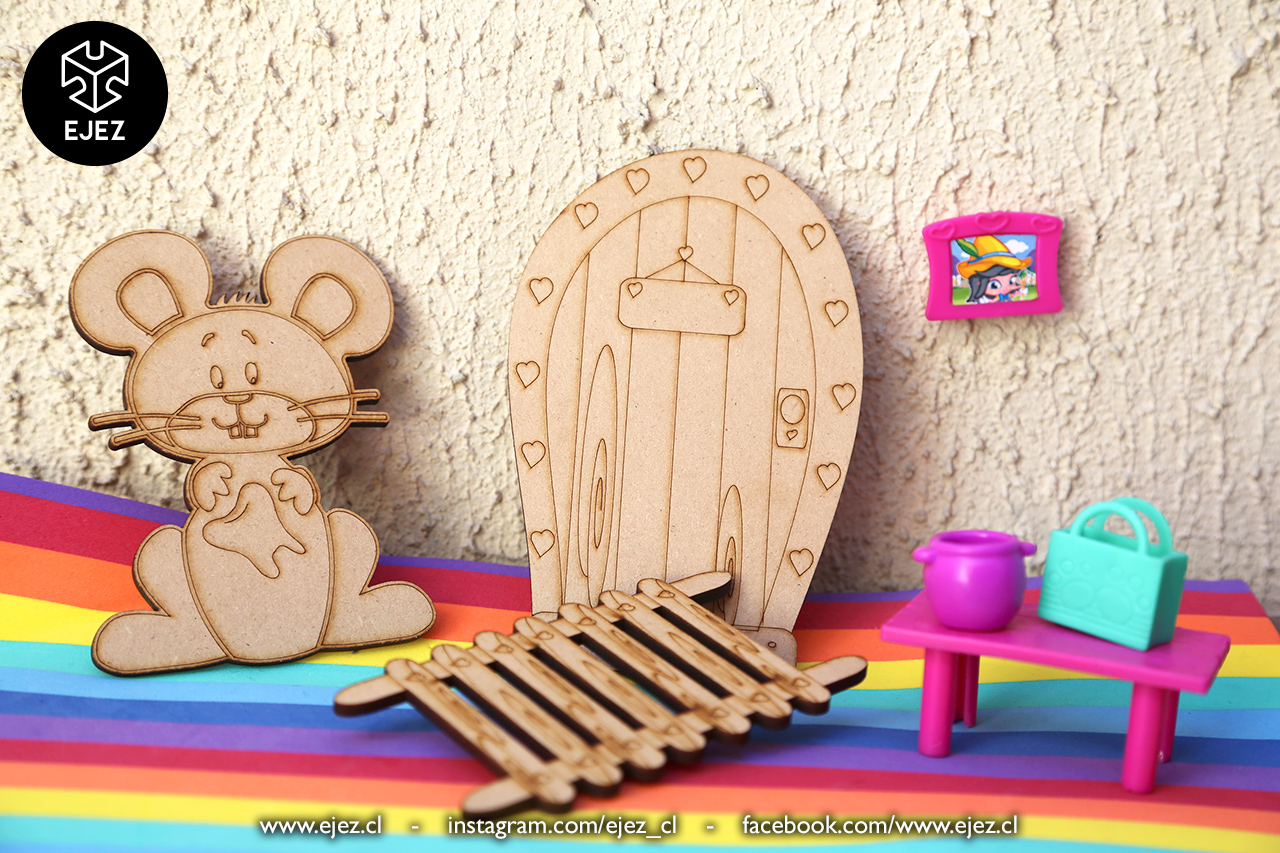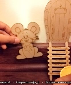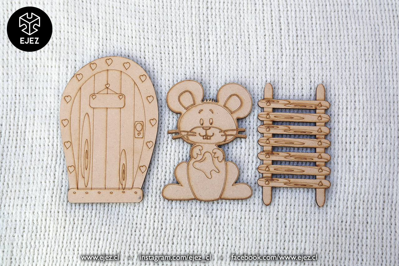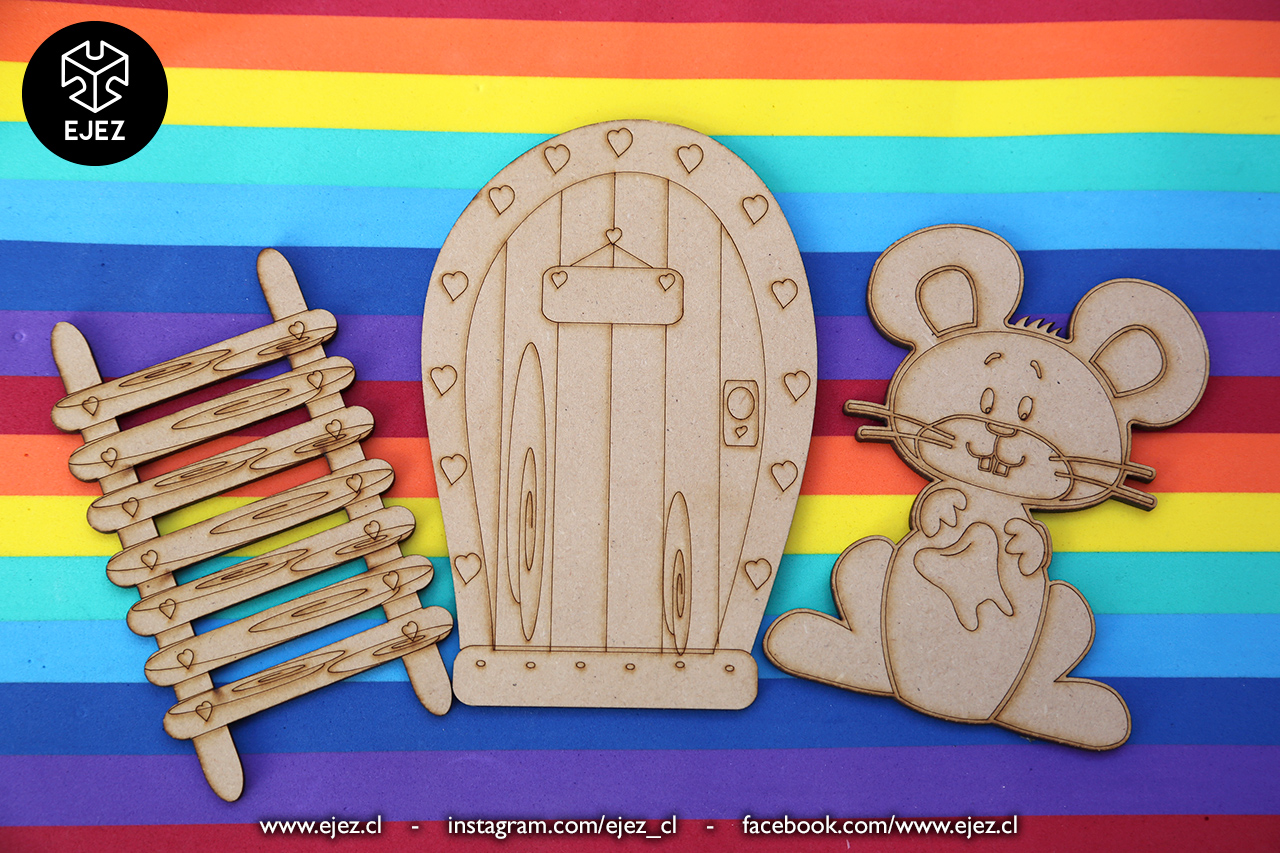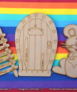 Este kit incluye una puerta mágica, una escalerita y un ratoncito, todos cortados y grabados en láser, listos para pintar y personalizar.