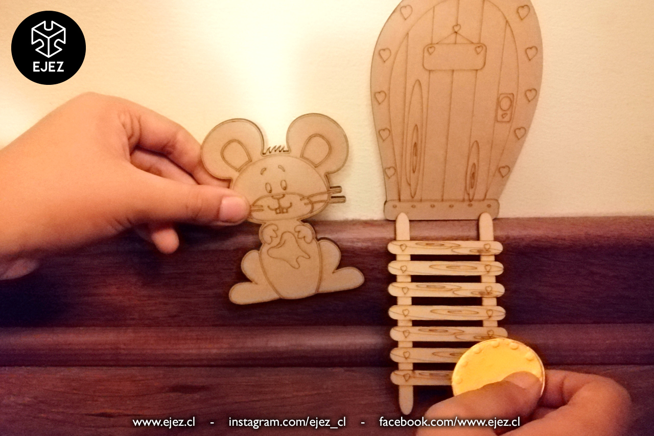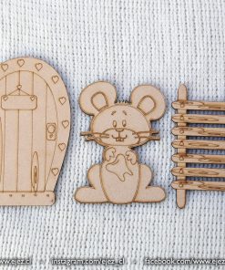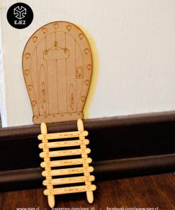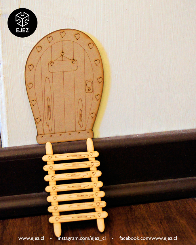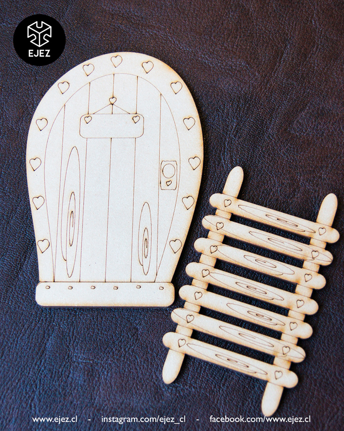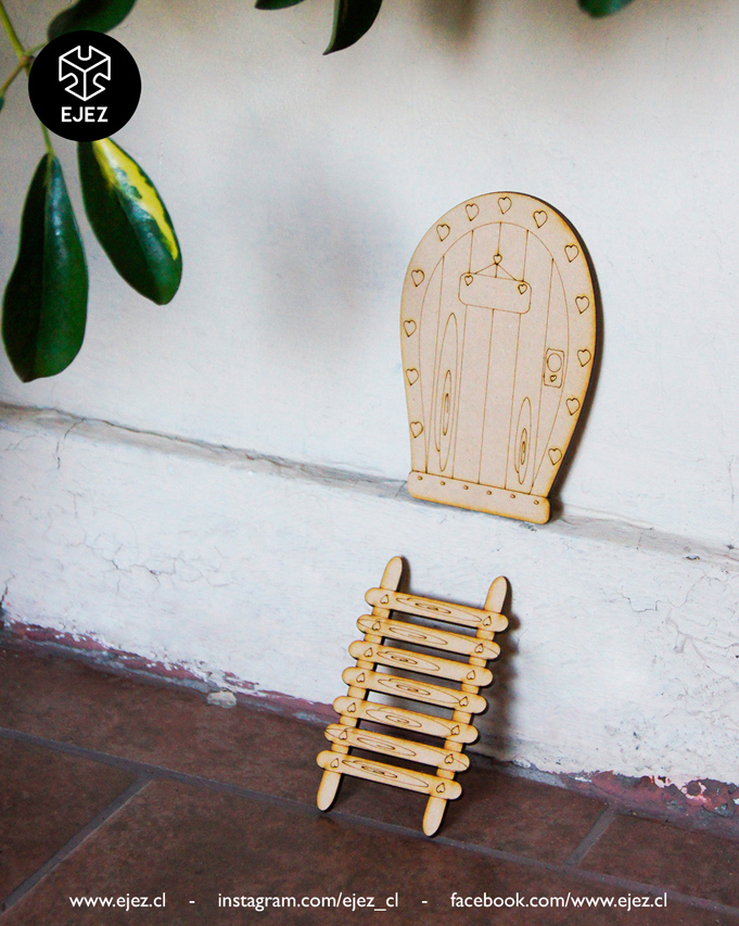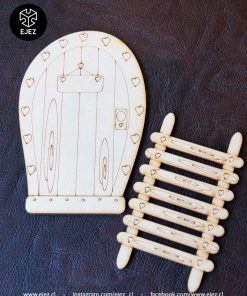 Este kit incluye una puerta mágica, una escalerita y un ratoncito, todos cortados y grabados en láser, listos para pintar y personalizar.
